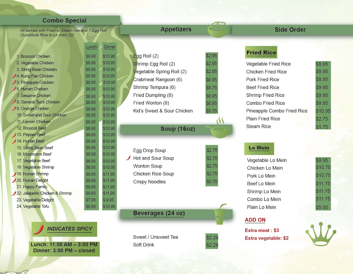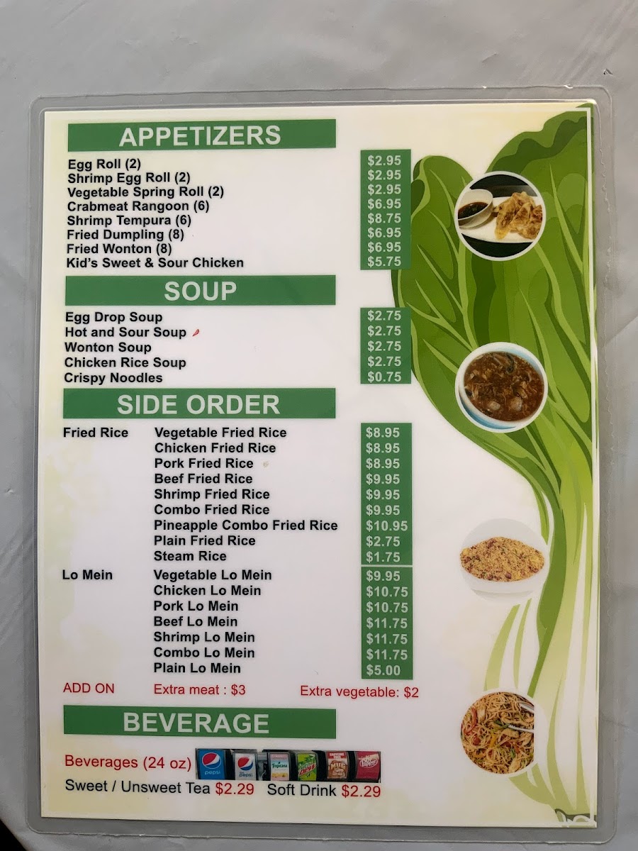 Assorted meats, vegetables, choice of side: fried, steamed rice, various noodles, or rice-free option.